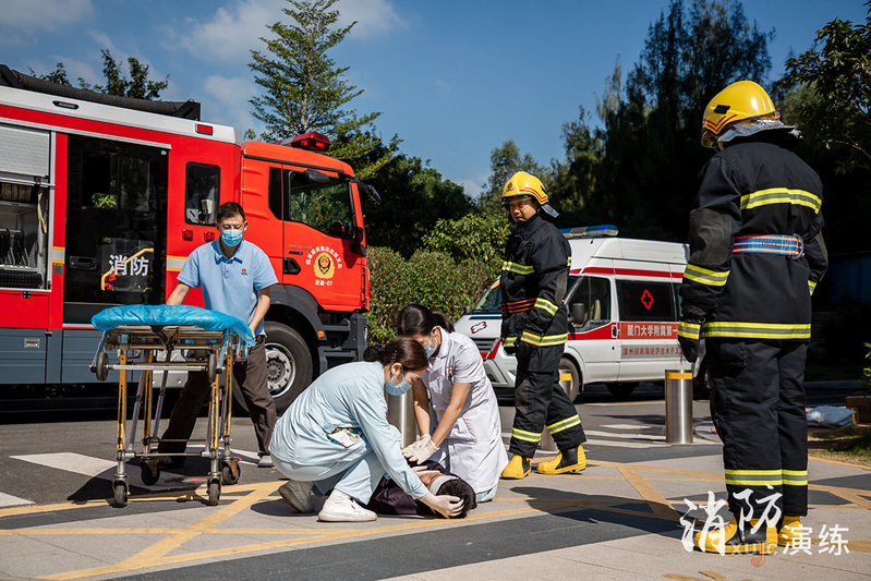 演练过程中,保卫部校卫队员与消防指战员迅速响应,分别协同漳州开发区医院救护人员,有条不紊地展开模拟伤员抢救行动。两组抢险人员配合默契,动作娴熟,以最快速度支起担架,稳稳当当地将“受伤”人员抬上救护车。